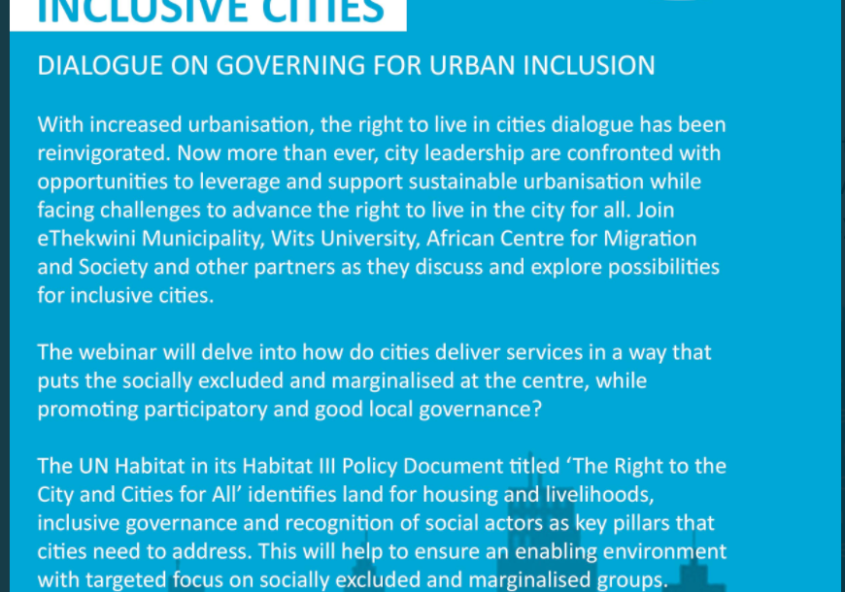 ACMS in collaboration with eThekwini Municipality hosted a webinar – The Future of Inclusive Cities: Dialogue on Governing for Urban Inclusion. The event took place on Friday, 9th of July 2021 from 12pm – 3pm on Zoom. You can watch/listen to the discussions here: