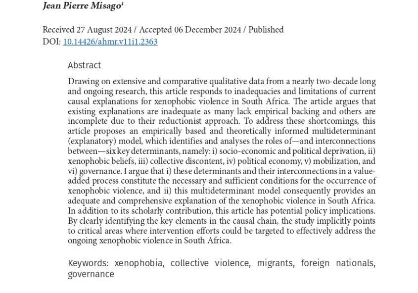 Drawing on extensive and comparative qualitative data from a nearly two-decade long and ongoing research, this article responds to inadequacies and limitations of current causal explanations for xenophobic violence in South Africa. The article argues that existing explanations are inadequate as many lack empirical backing and others are incomplete due to their reductionist approach. To…