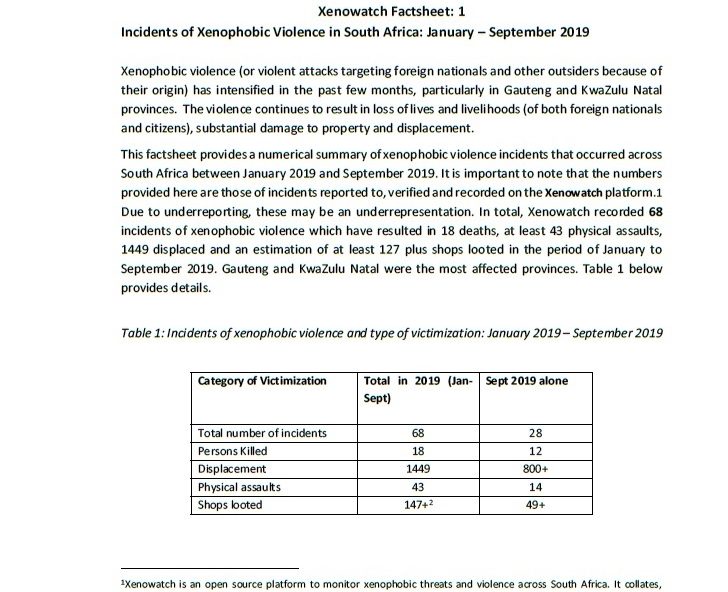 This factsheet provides a numerical summary of xenophobic violence incidents that occurred across South Africa between January 2019 and September 2019. Prepared by: Silindile N. Mlilo